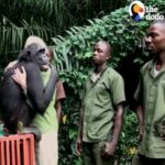 Rescued chimp pauses to hug Jane Goodall before returning to the wild.